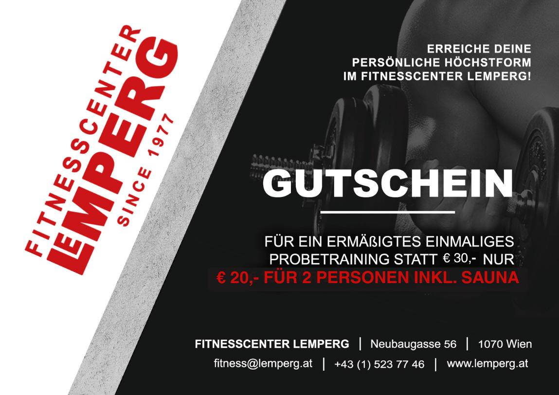 Die Tageskarte für Ihr Probetraining im Fitnesscenter LEMPERG beträgt € 13.-. Bei Abschluß einer Mitgliedschaft innerhalb 30 Tage, wird dieser Betrag gutgeschrieben!